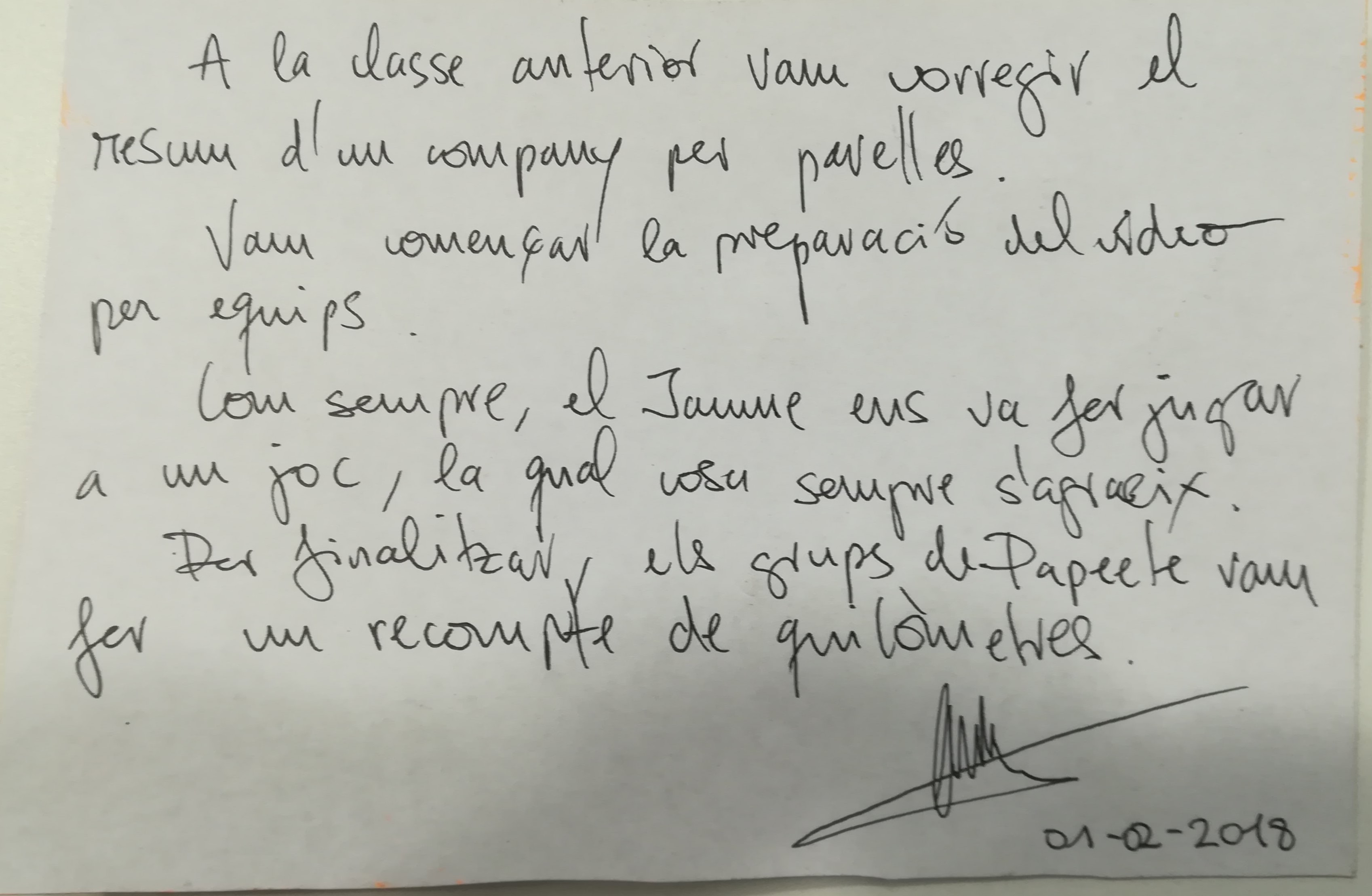 A continuació, vam corregir el resum d’un company basat en la classe anterior. Entre tots vam escollir un títol per a aquest resum. Tot seguit, vam continuar fent exercicis sobre els pronoms i es van resoldre alguns dubtes que teníem. Aquests exercicis van ser una mica complicats ja que havíem de substituir alhora dos pronoms de l’oració. Tot i així, amb l’ajuda del professor, els vam acabar resolent.