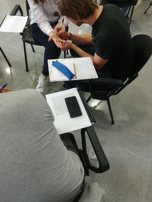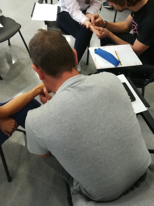 Avui ha estat el segon dia de classe. Han vingut alumnes que no havien pogut venir el primer dia. Per aquest motiu i per facilitar la disminució del nivell d’estrès, el professor ens ha col·locat en cercle i, deixant una cadira lliure, l’alumne que tenia la dreta lliure havia de convidar un altre a asseure-s’hi. Així, d’aquesta manera, fins que tots ens hem mogut.
