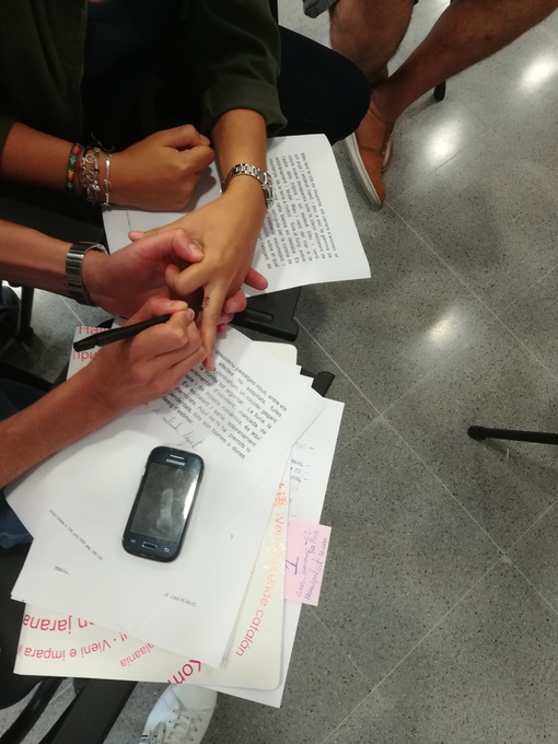 Després d’això, ens ha agrupat en grups de 4 persones. A cada grup se li ha assignat el mateix fragment d’un text, el qual, després de llegir-lo de forma individual, havíem de posar en comú diferents coses: en quin moment del dia crèiem que es situava, quines emocions ens evocaven, etc. Un cop fet això, i després de numerar-nos en cada grup de l’1 al 4, ens hem tornat a reagrupar, de tal manera que en cada nou grup quedés el text complet sumant-ne els diferents fragments. Un cop ajuntat i posat en comú l’article, el professor ens ha posat en context sobre el text després de fer-nos expressar en una paraula el que ens havia fet sentir. Ha explicat que l’autora és la filla de Prudenci Bertrana, autor de la famosa novel·la Josafat, Aurora Bertrana, la qual va escriure quan vivia a Papeete (Tahití). Aquest any es clou l’Any Bertrana. Tant el pare com la filla van trencar els esquemes de l’època amb la seva aportació a les lletres catalanes. Aurora Bertrana