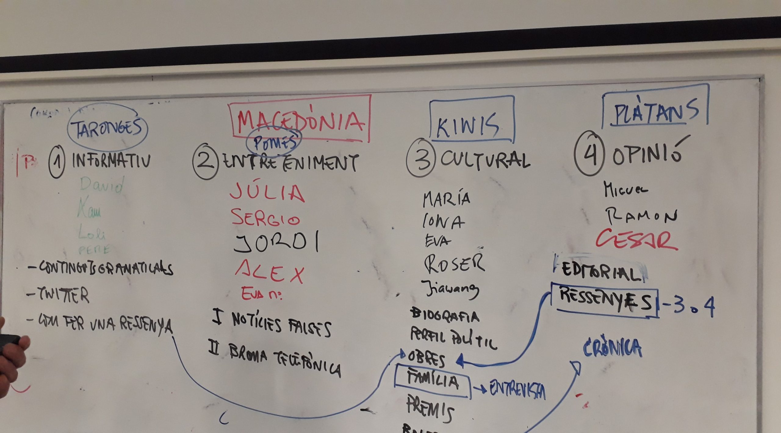 19.55 h: La primera posada en comú del grup ha estat un èxit. En les properes sessions acabarem d’enllestir la nostra part del programa. La resta de grups, també semblen satisfets amb el treball realitzat.