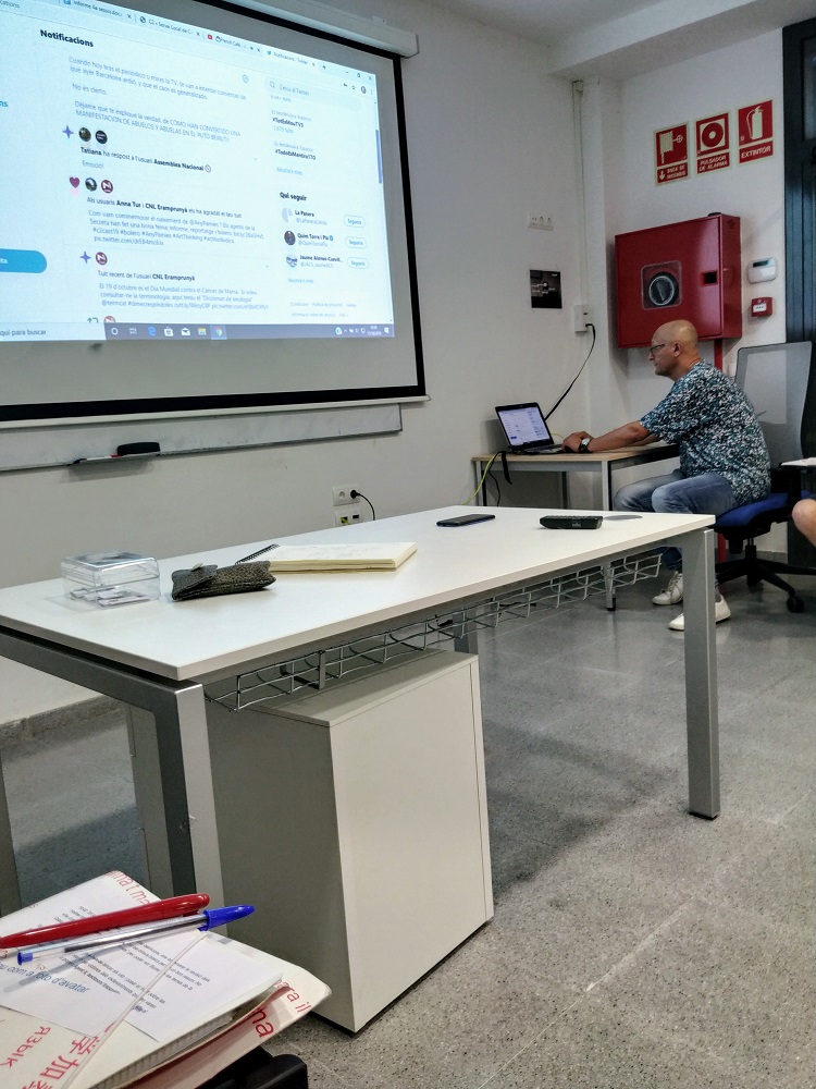 18.45: Fi de l’esbarjo. El Mestre ens va ordenar fer una crònica de 300 paraules amb el tema que ens porta acompanyant a cadascú de nosaltres en les últimes sessions. Havíem de recordar l’esquema que havíem tractat minuts abans i endinsar-nos en la redacció de la crònica. Sort que  part del text teníem ja redactat al Twitter. Tot i així, hi hauria feina.