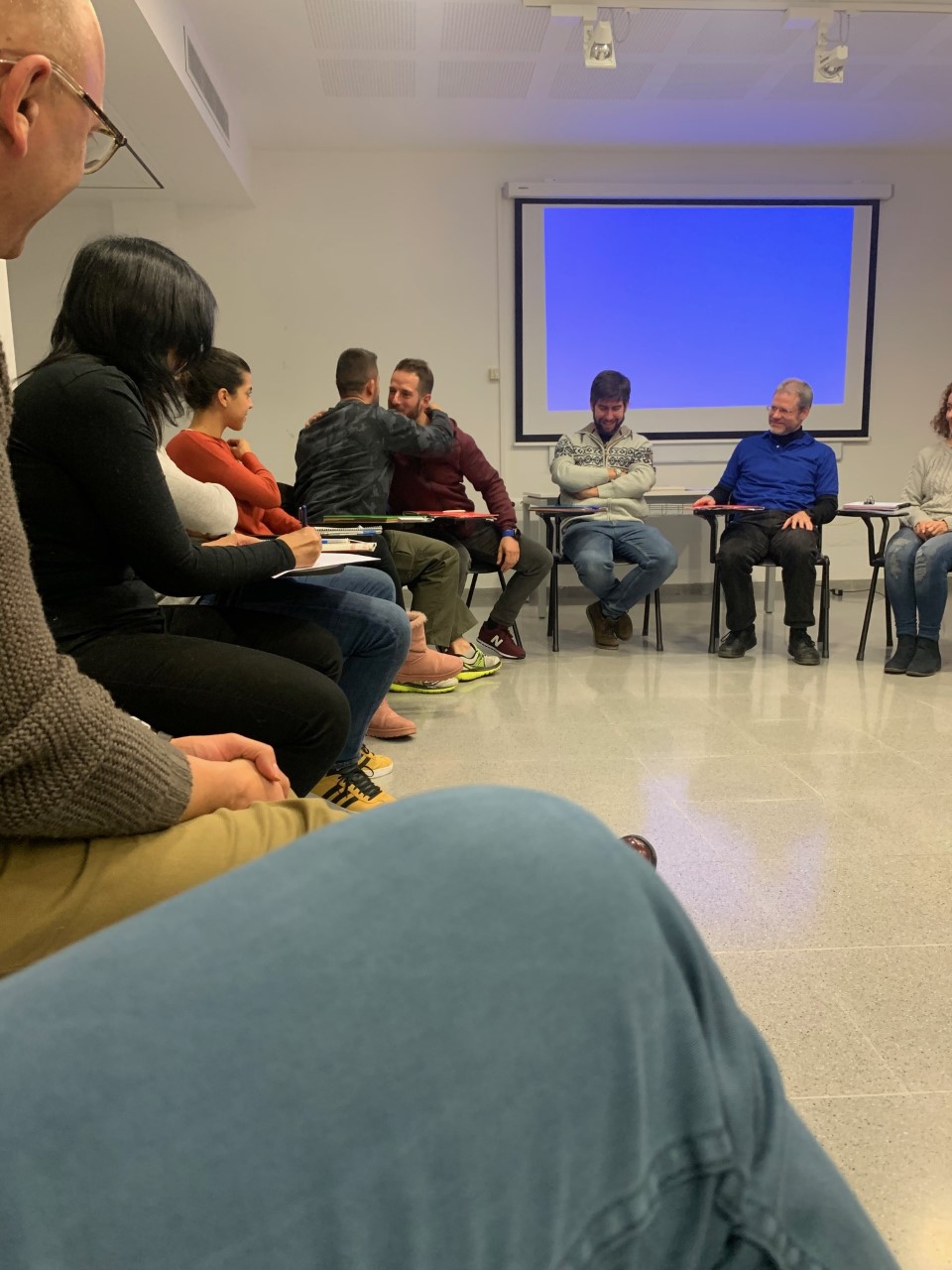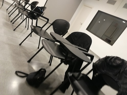 18.OO h: Comença la sessió. Entrem tots a la sala i un tècnic està ordenant les cadires meticulosament –el que no sap és que no trigarem a desendreçar-les. És una sessió amb molt poca afluència de refugiats; segons sembla, han decidit celebrar la castanyada encoberta. Som només 14 refugiats. El professor ens pregunta què ens ha semblat la sessió anterior.
