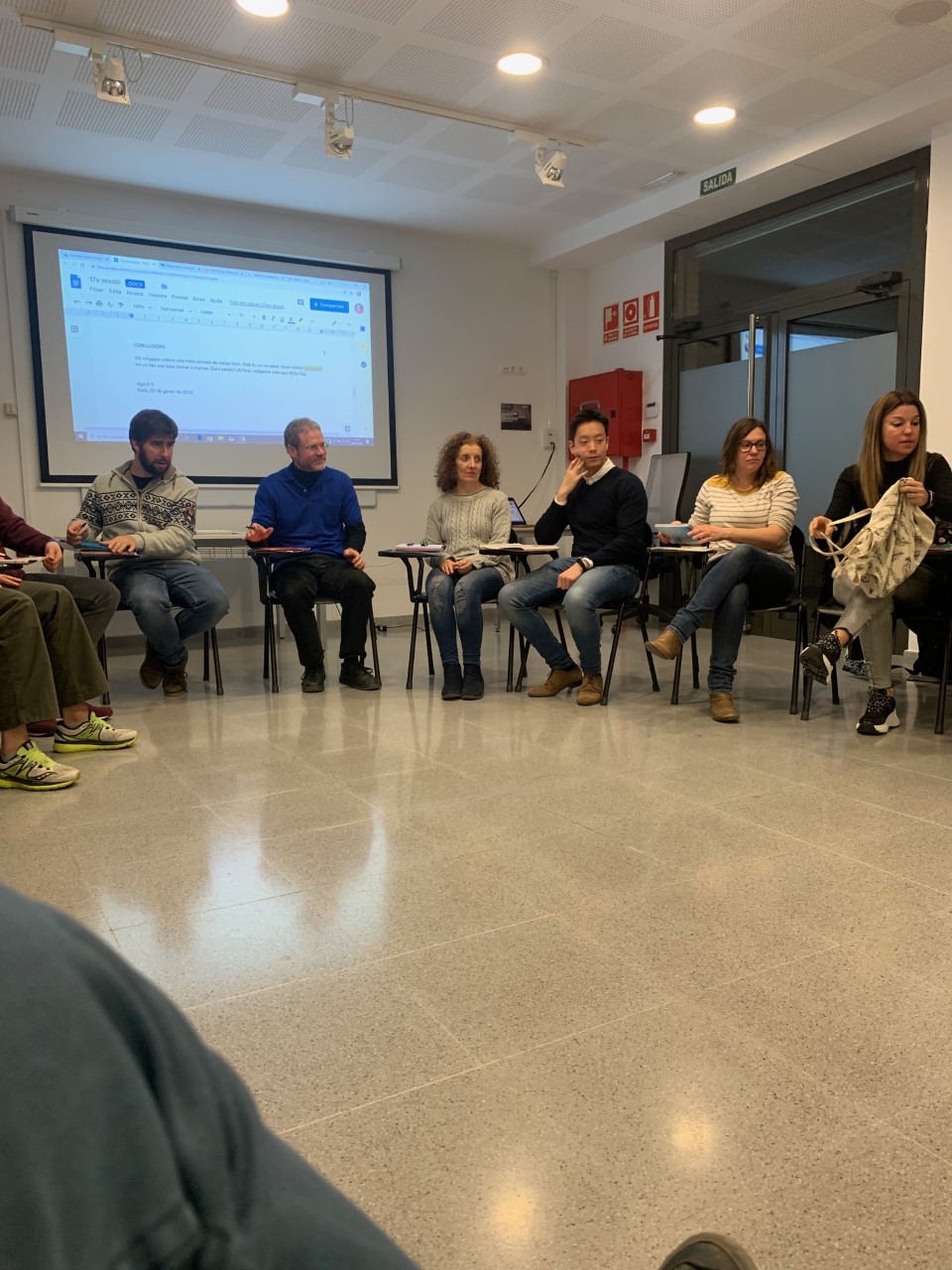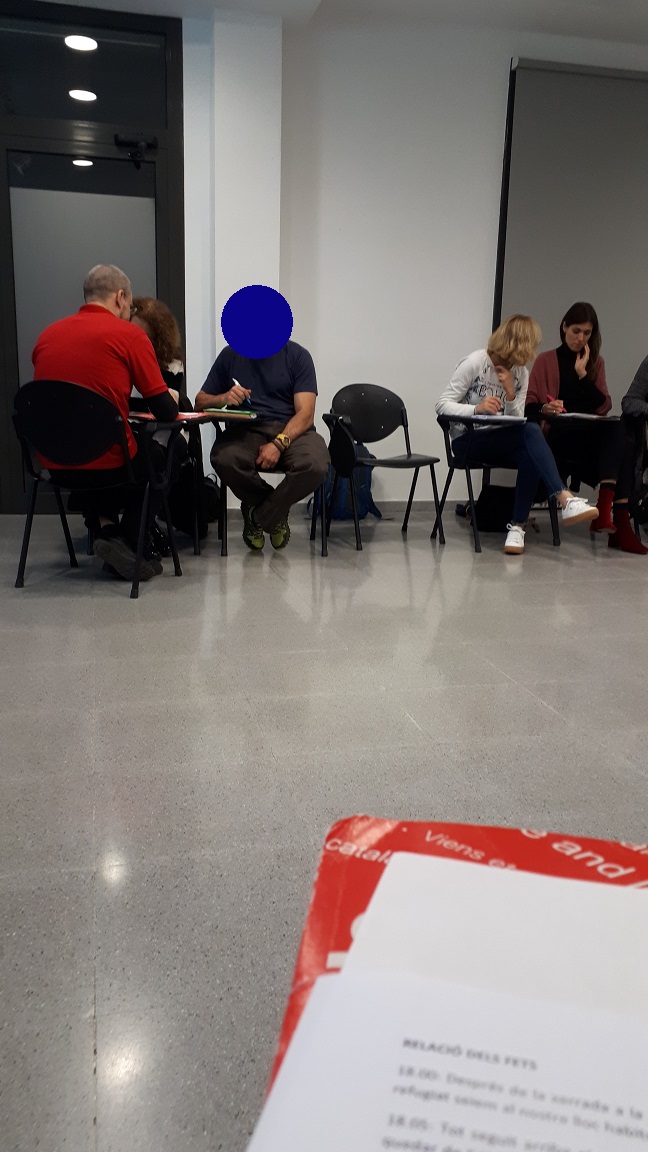 18.10: Ens posem per parelles per poder corregir l’informe de la sessió anterior. De sobte, a l’últim moment, arriba un refugiat que s’havia quedat enrere i podrem fer un “trio”.