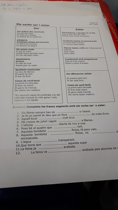 18.55 h: El general reparteix uns exercicis sobre l’ utilització dels verbs ser/estar. Diu als refugiats que primer els facin individualment i que després els contrastin amb els grups ja formats. Els refugiats troben familiars els exercicis i comencen a consultar el Twitter. Comproven que algunes de les oracions dels exercicis es troben a l’enllaç de la sessió virtual. Tot i així, els exercicis generen controvèrsia, motiu pel qual els refugiats no ho tenen clar del tot. En finalitzar l’exercici, el general aclareix els dubtes i els refugiats en prenen nota.