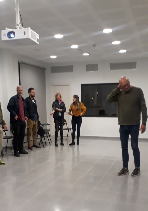 18.50 h: És l’hora del joc. El professor per descol·locar-nos ens proposa un joc, A i B. Ens posem tots de peu. Escollim a dues persones que seran A i l’altra, B. A la veu de “A” ens aproparem a la persona escollida com a A. A la veu de “B” ens aproparem a l’altre persona B. -Quin desgavell!. Tots estem al mateix lloc i quan canviem cap a l’altra persona no ens movem gaire. Ha estat divertit.