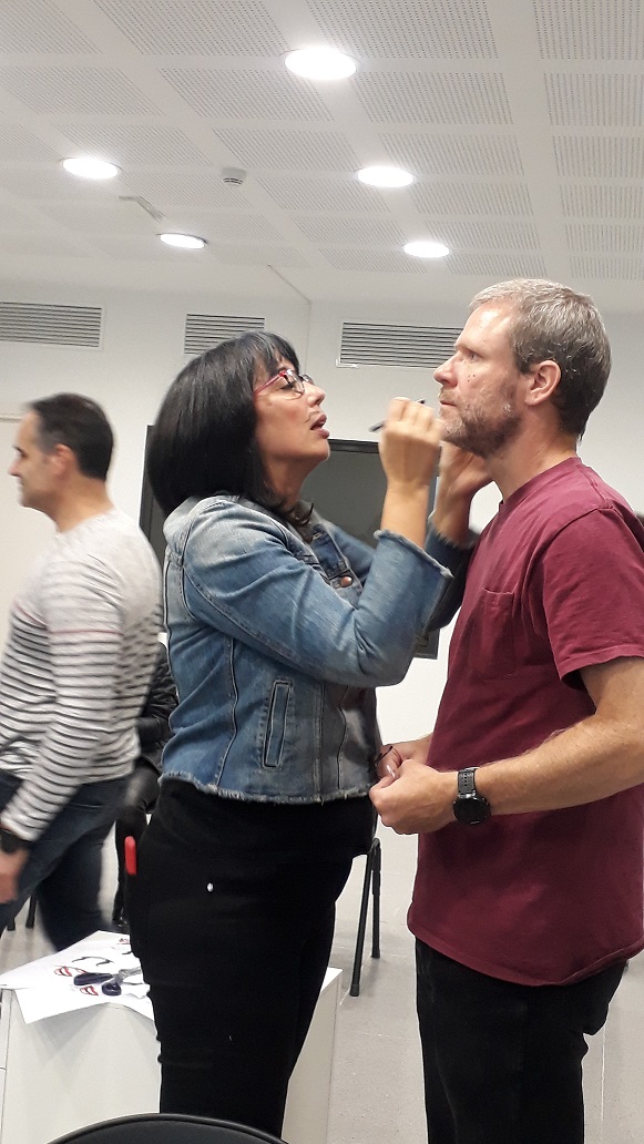 19.20 h: “Tots cap a Immigració”, ens ordena el professor. Segellem el visat i fem una nova fotografia per al passaport. El professor ens porta pintallavis i postissos per fer-nos les fotografies. Si ens maquillem ens donarà més pàmies que si ens posem un postís —ostres, quina gràcia, ha aparegut El Joker! És un moment molt divertit ja que hi ha companys que són companyes en la seva nova identitat. Ja us ho podeu imaginar! Les fantàstiques companyes ajuden a maquillar-nos per aconseguir uns meravellosos pàmies.
