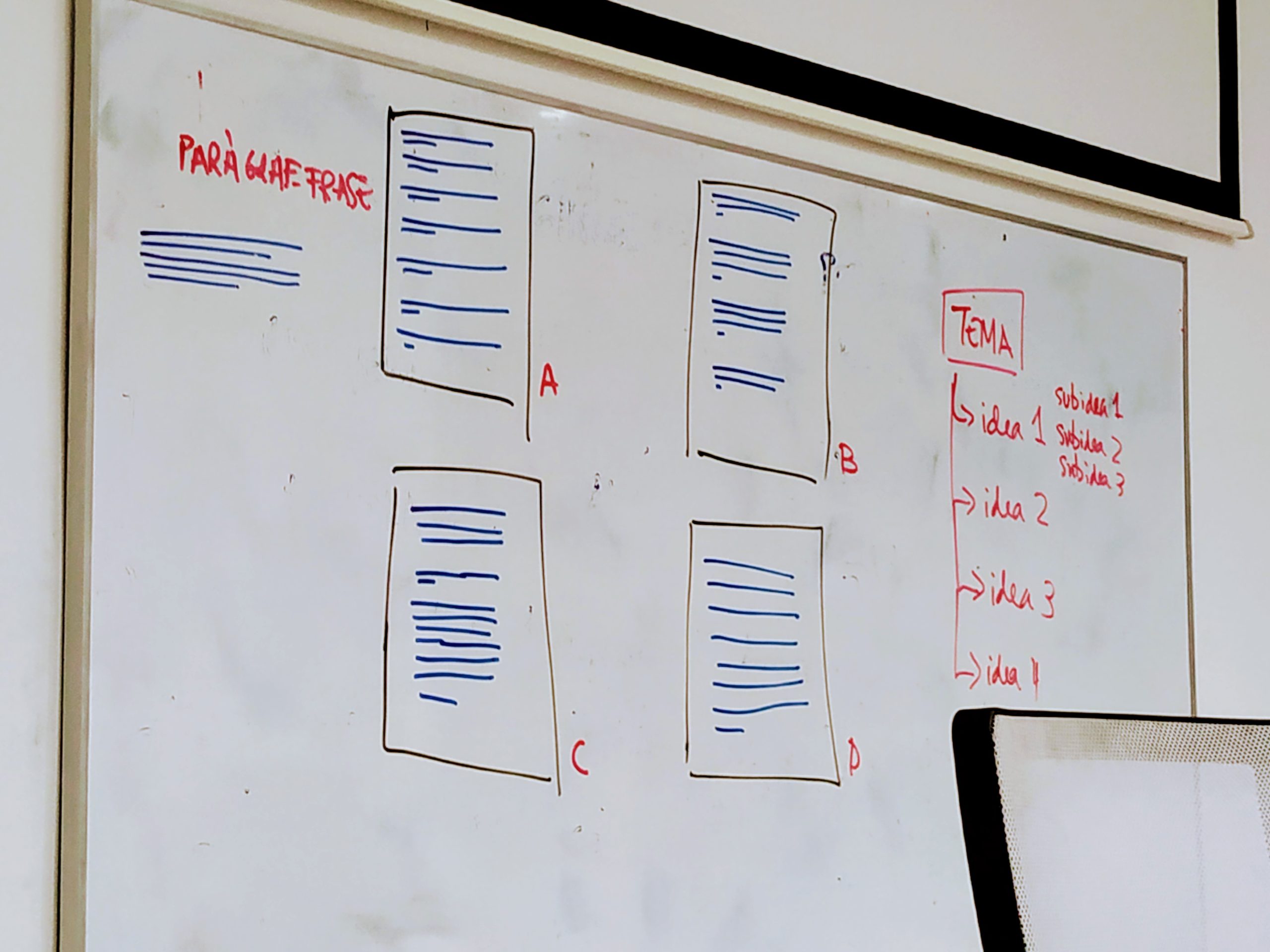 18.30 h: El general ens pregunta si sabem què és una ressenya. Els refugiats, amb cara de sorpresa, contesten que no. Reparteix uns fulls amb un text. Ens mirem entre nosaltres perquè aquest text és estrany. Ens ordena intentar separar el text, ja que està tot junt. Veient les cares dels refugiats, ens demana atenció. Agafa retoladors i comença a dibuixar a la pissarra. Què està fent? Ha dibuixat quatre requadres amb unes ratlles a l’interior. Ens dona l’explicació dels diferents tipus de paràgraf. Ara sí, separem el text correctament.