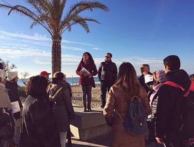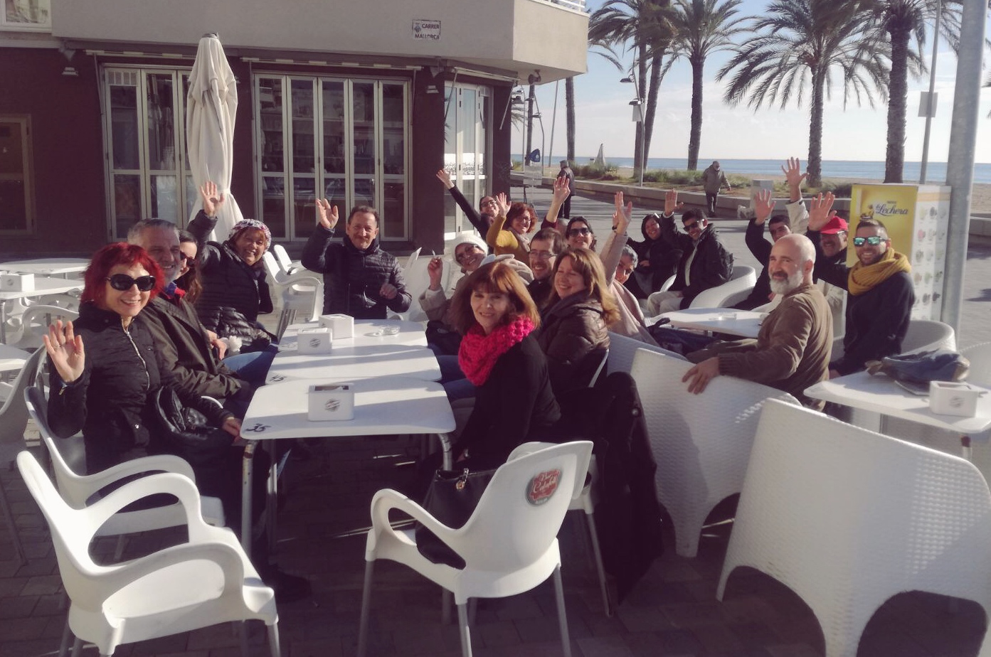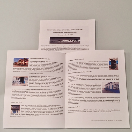 Els alumnes de nivell Intermedi 1 de l’Oficina de Català de Calafell han organitzat una ruta per a un grup d’alumnes (també d’Intermedi 1) de l’Oficina de Català del Vendrell. “Fem un tomb per la història de la platja de Calafell” -títol amb què han batejat la ruta- comença al Sanatori Marítim de Sant Joan de Déu i acaba a l’Hotel Miramar. Més d’una hora i mitja de ruta amb 12 parades en què els estudiants han anat explicant la història recent del nucli de la Platja: des de les nombroses transformacions que hi ha hagut fins a la història de les botigues de pescadors i d’edificis emblemàtics com el Sanatori, el Museu Casa Barral i la Confraria de Pescadors.